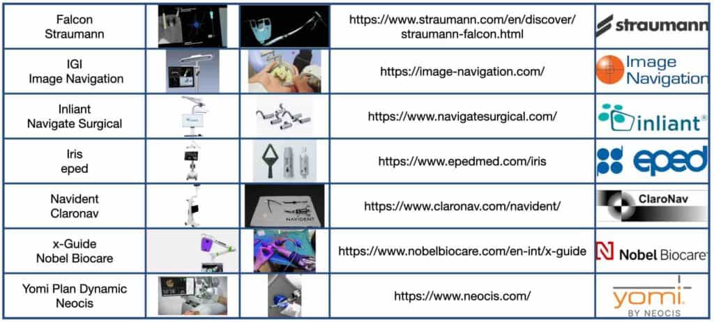 Older and new products and companies in the field of dynamic navigation in computer assisted implant dentistry, arranged in alphabetical order.