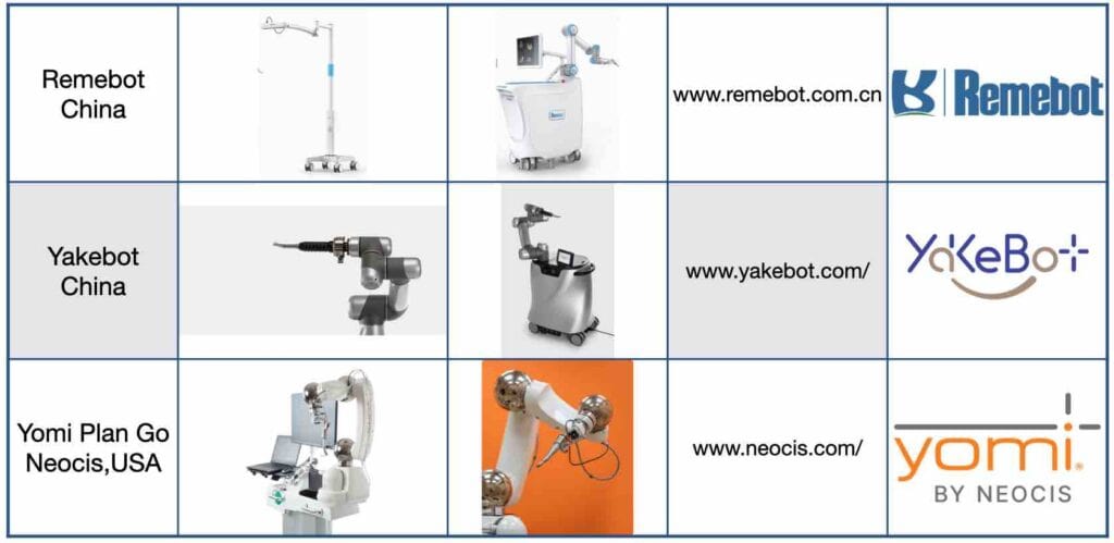 Three commercially available autonomous robotic implant systems from China and United States.