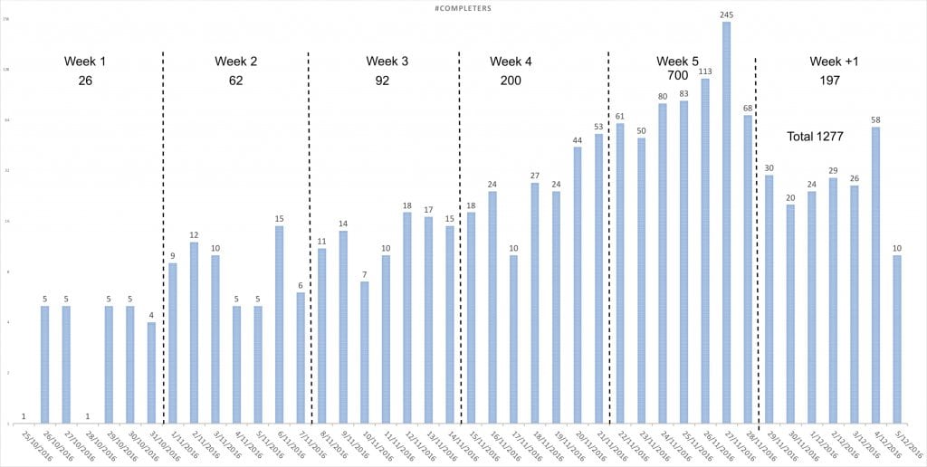 Looking at figure 1, you can see the number of completers for every day of the five weeks of the courseAlthough there is a significant number of students following my “prescribed” journey and completing the course at around the fifth week, the truth is that more people completed the course earlier than I had intended them to. And the rest? What about the 75 % of “drop outs” ? Well here it is that it gets even more interesting. Among the non-completers were large numbers of active students, who spent significant amount of time attending certain modules, participating into discussions or revisiting specific content regularly, so that we had to come up with the name “diggers” to describe them. They were however demonstrating a typical “non-linear” learning behaviour, completely disregarding my prescribed A-Z pathway in favour of their own unknown to me interests and priorities. In the end, many of them commented very favourably for what they got out of the course, but most of them never bothered to take assessments or collect points for completion and a certificate.