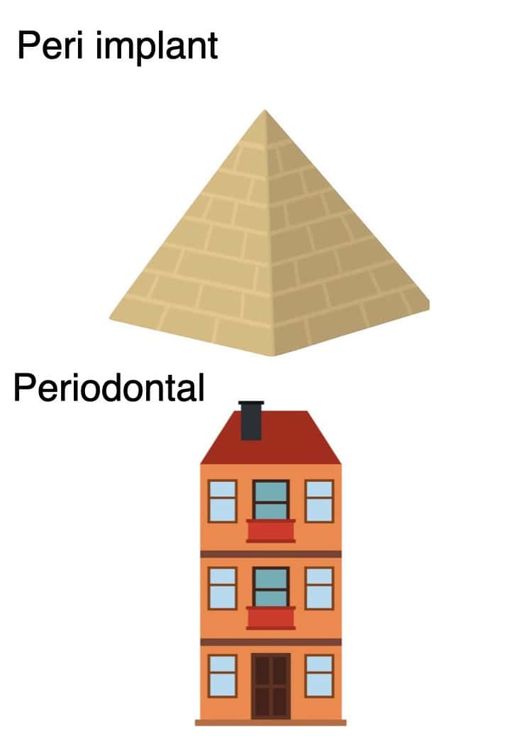 So thinking as an architect, the peri-implant mucosa resembles a Pyramid, where the wider the base the higher you can reach. On the contrary, the periodontal tissue looks more like a townhouse in Amsterdam: although really squeezed in width, it can still reach a 4-storey height! But for now it’s only nature that builds townhowses, we are into pyramids.