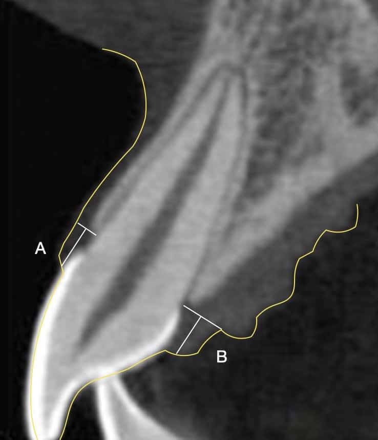 Note the natural architecture of the periodontium, with a narrow base of the soft tissue at the margin of the bone and a longer dimension in height! This is especially pronounced at the buccal sites (A), but the base widens palatal (B) where the angle of the palatal alveolar ridge widens. Looks great, but don't try this with implants!